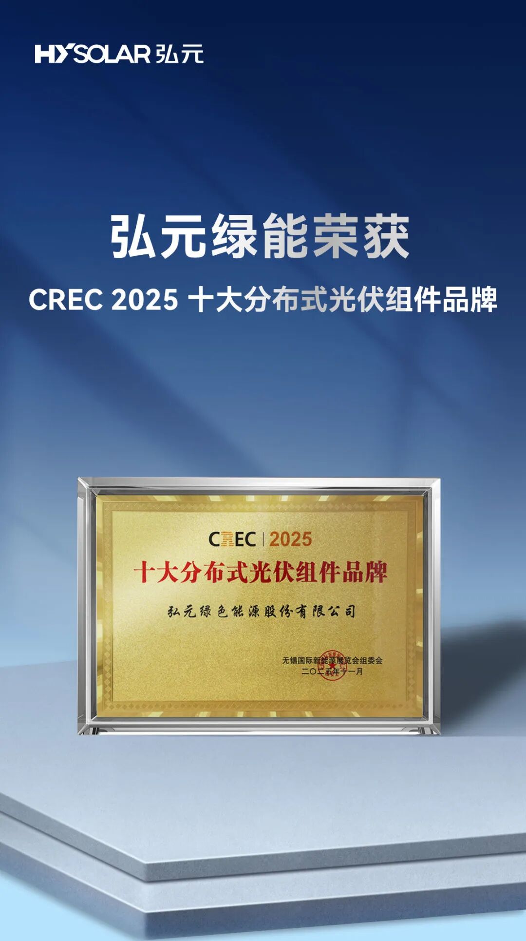 2025 CREC无锡国际新能源展期间,弘元凭借在分布式光伏领域的亮眼成绩荣获“CREC 2025 十大分布式光伏组件品牌”。这一荣誉,是行业对弘元产品可靠性、场景适配性及全链协同能力的肯定,也体现了市场对企业长期稳健发展的认可。